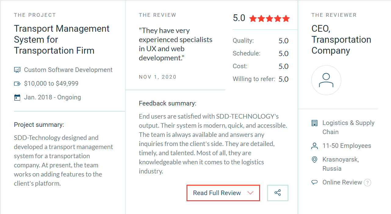Our latest review is from a transportation firm. We’re helping them build a transportation management system to make their process easier and more efficient. As it stands our team is hard at work adding exemplary features to their platform.